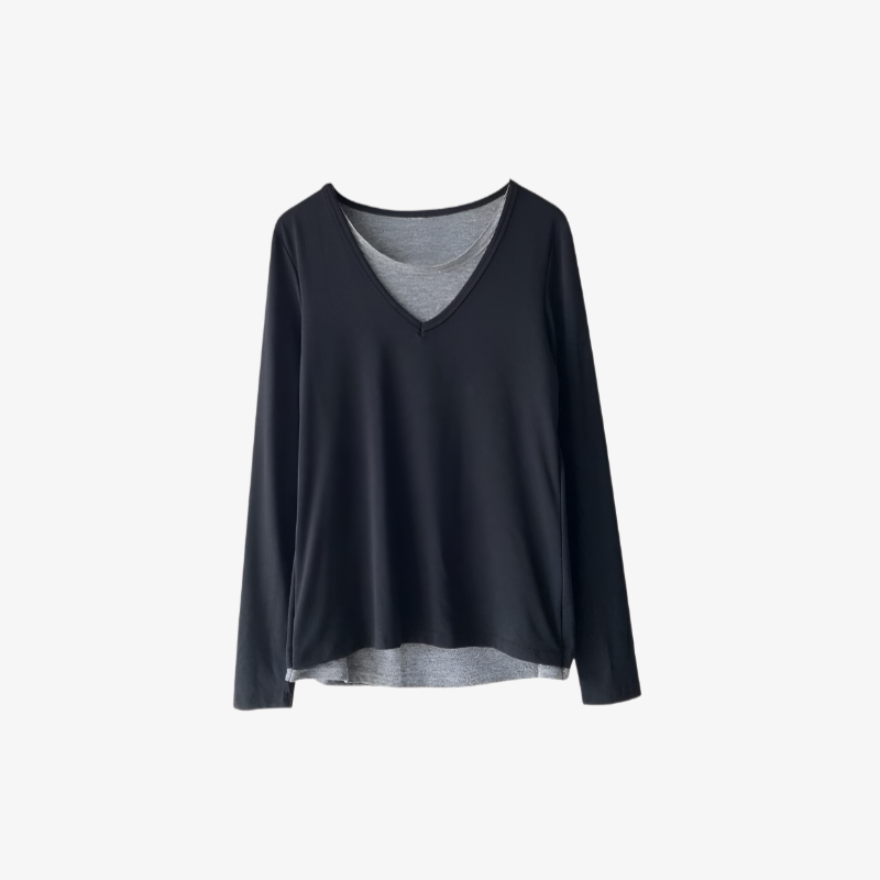 レディース秋長袖Tシャツ、秋パッチワークフェイクツーピースセット、新韓国スタイルカジュアルシックトップス、Tシャツベースレイヤー
